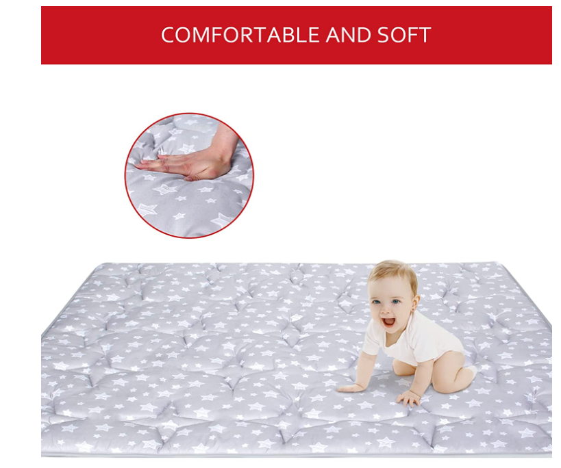 - Más gruesa y suave: esta alfombra de juego de 50 x 50 pulgadas para parque infantil con acolchado más grueso y suave hace que sea perfecta para que tu bebé gatee o que tu bebé juegue. Con el bonito patrón gris y la tela ultrasuave, “Probado para sustancias dañinas” de GLOBAL OEKO-TEX, nos aseguramos de que a tu bebé le encantará esta alfombra de juego para bebé.