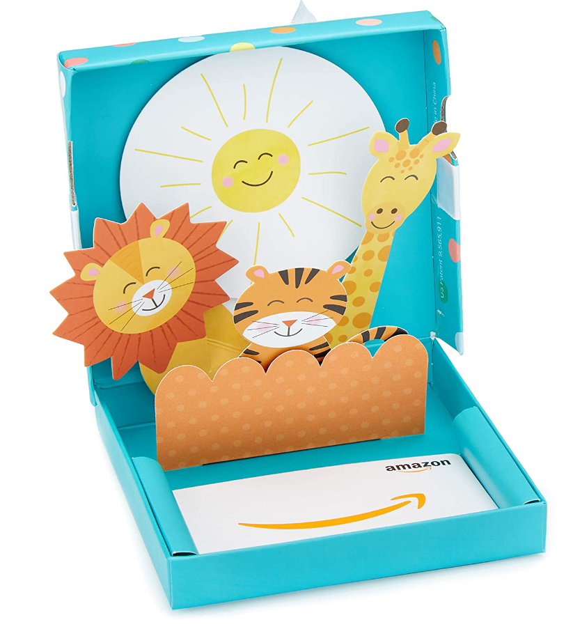 Tarjeta de regalo de Amazon.com en una caja de regalo de bienvenida para bebé.