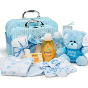 Nuevo juego de regalo para bebé recién nacido, 2 cajas de recuerdo azules con ropa de bebé, oso de peluche y artículos esenciales para recién nacidos